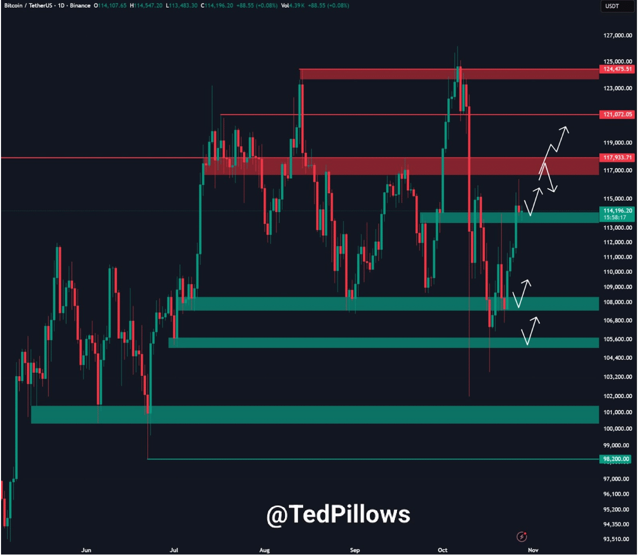 As per Ted’s analysis, Bitcoin is trading at a high of about $114,000 and has bounced off the support of $113,500. This level has served as a stable floor in retests.