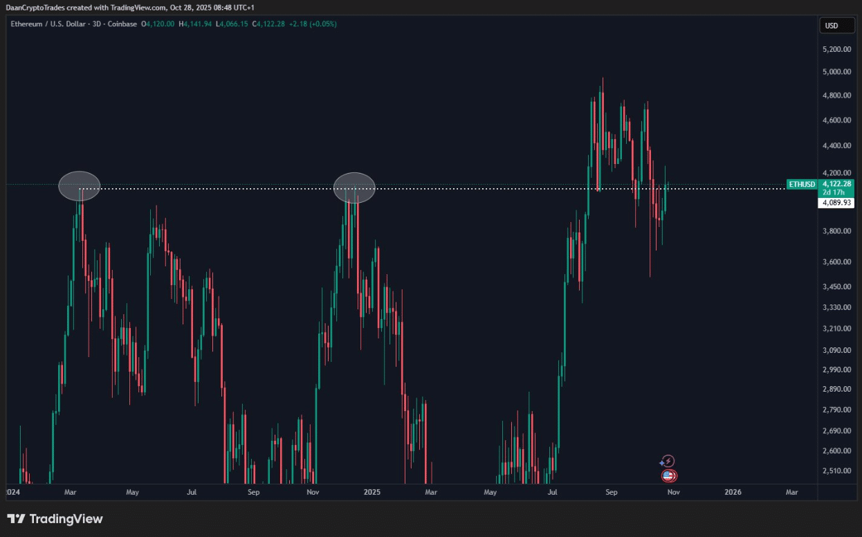 According to Daan Crypto, Ethereum is once again pushing into a major resistance area that previously marked cycle highs.