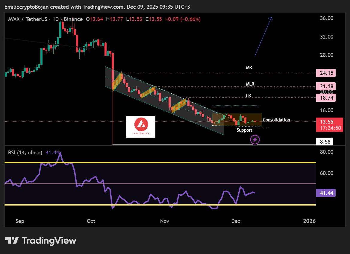 AVAX is approaching a critical test at the $12.82–$13.00 support zone.Â