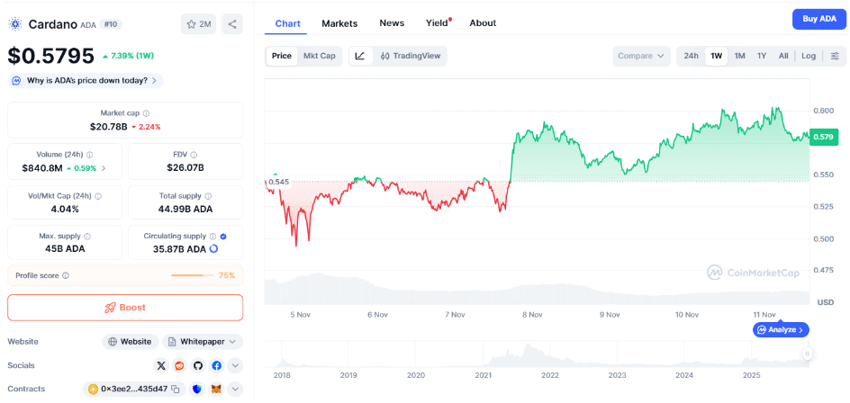 $0.60 has served as a near-term resistance area, which has limited the recent upside moves. In the meantime, the support is still at close to $0.56. For any bullish breakout to materialize, the price of Cardano must break and close above the $0.60–$0.62 range with volume expansion.