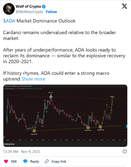 Wolf of Crypto, a top expert, says the Cardano price could repeat its 2020–2021 explosive rally. The expert posted a chart that showed that the price of ADA bottomed out around $0.60 before soaring to $1.50, before climbing to $3.50 in 2026.