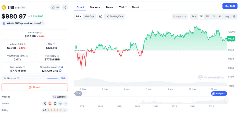 The Binance Coin price has fallen below the $1,000 mark after a recent uptick fueled by Donald Trump’s $2,000 stimulus announcement. However, CoinMarketCap data shows that the BNB price is up 3.33% on the 7D timeframe.