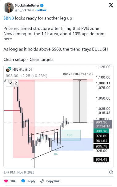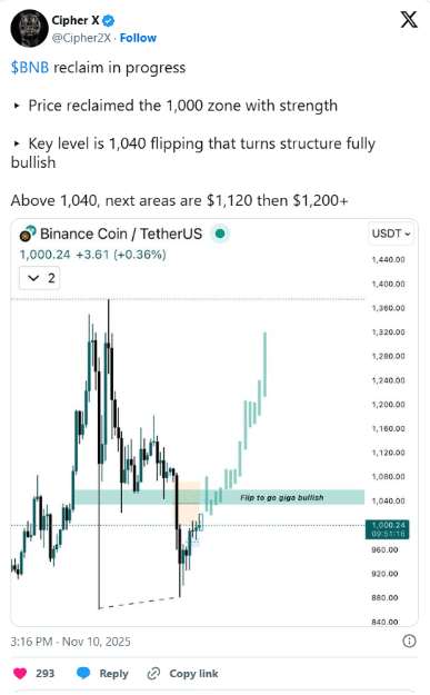 Nevertheless, Cipher X stated that the Binance Coin price should first reverse the resistance at $1,040. Another analyst, Blockchainaballer, forecasts that the Binance Coin price could soar to $1,100.