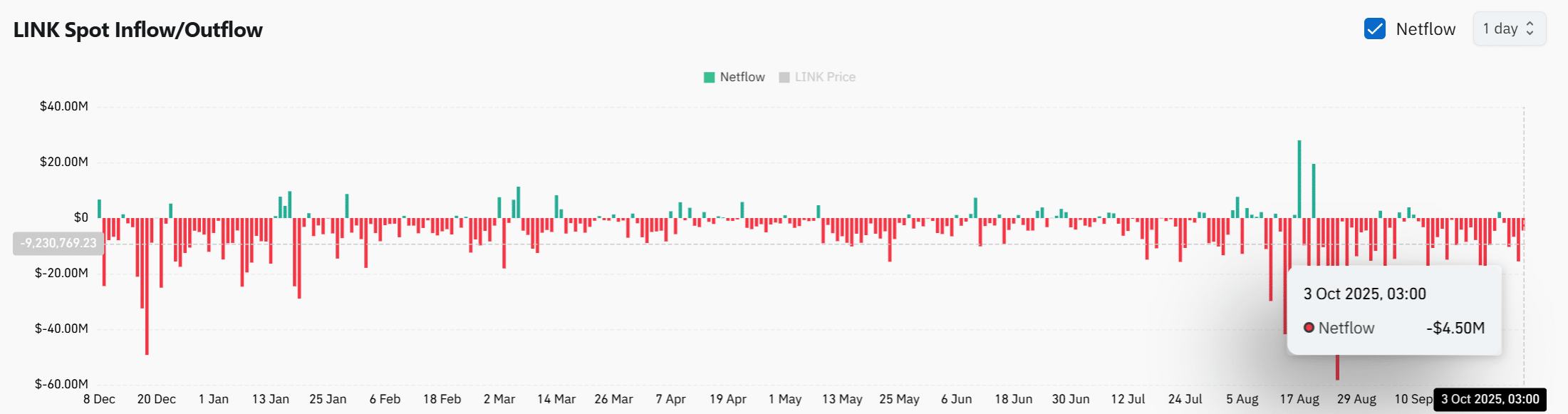 Chainlink recorded $4.5 million in exchange outflows, on the 3rd of October, a sign that investors are choosing to move their holdings into private wallets rather than keep them on exchanges.