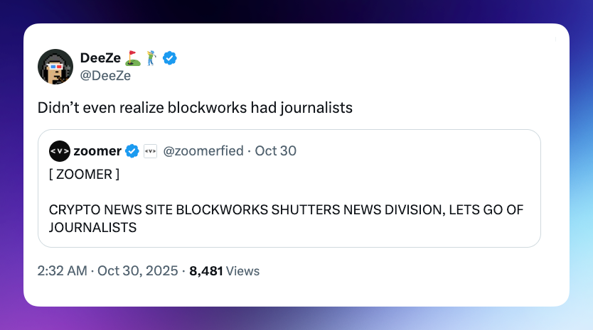 Naturally, crypto, despite occasional projects aspiring to save journalists or the media, isn’t spared the same dynamics. Ever since Bullish bought Coindesk, eroding its editorial freedom, crypto media as a whole has been somewhat disappointing. Last week, Blockworks announced that it’d be shutting down its news section to focus on something more profitable (the subtext I read).Â