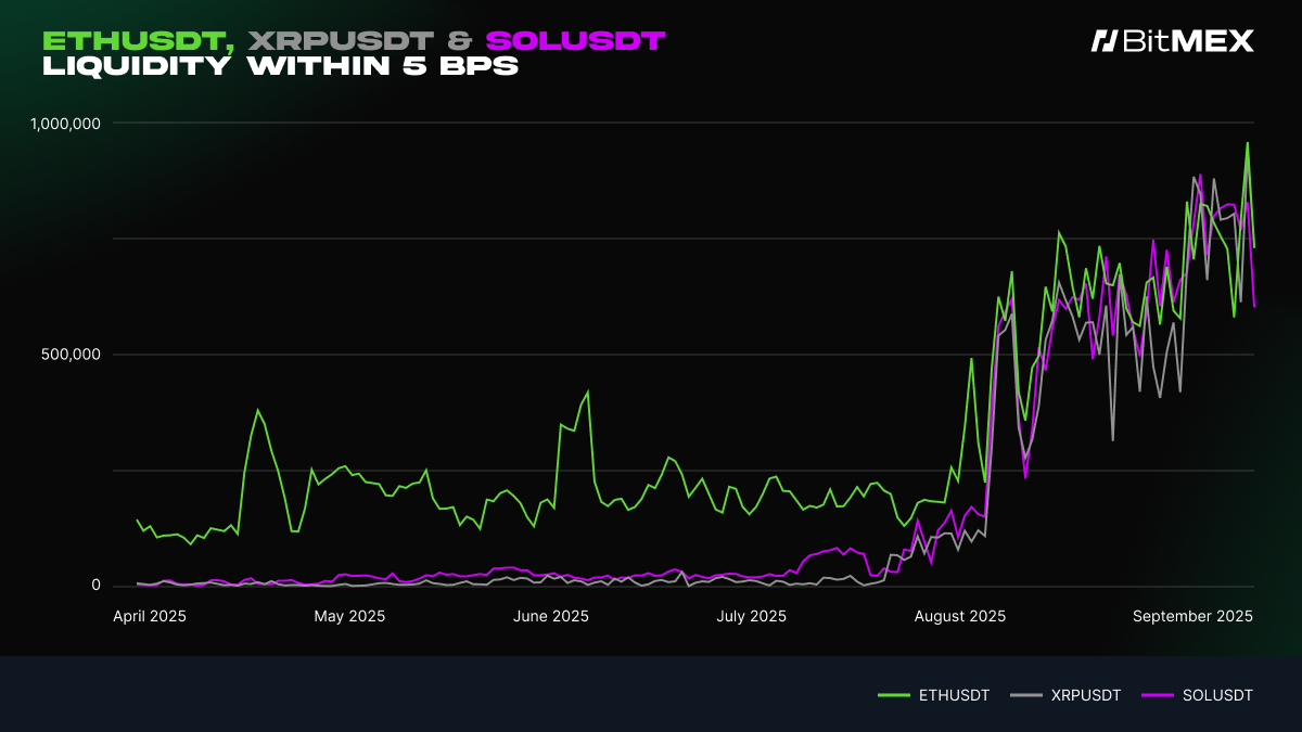 我们在 8 月份完成迁移后不久,就分享了流动性方面的一些显著提升。自此之后,我们的主要合约(XBTUSDT 和 ETHUSDT)以及其他合约(XRPUSDT、SOLUSDT、HYPEUSDT 等)的流动性均显著提升,如下图所示。