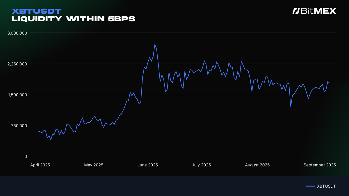 下图显示了 XBTUSDT 从 2025 年 4 月(迁移前)到 2025 年 9 月(迁移后一个月)的流动性变化,变化幅度在 5 个基点以内。