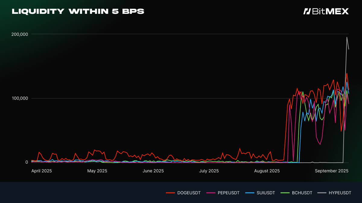 下图显示了从 2025 年 4 月(迁移前)到 2025 年 9 月(迁移后一个月)DOGEUSDT(红色)、PEPEUSDT(粉色)、SUIUSDT(蓝色)、BCHUSDT(绿色)和 HYPEUSDT(灰色)的流动性在 5 个基点以内的情况。