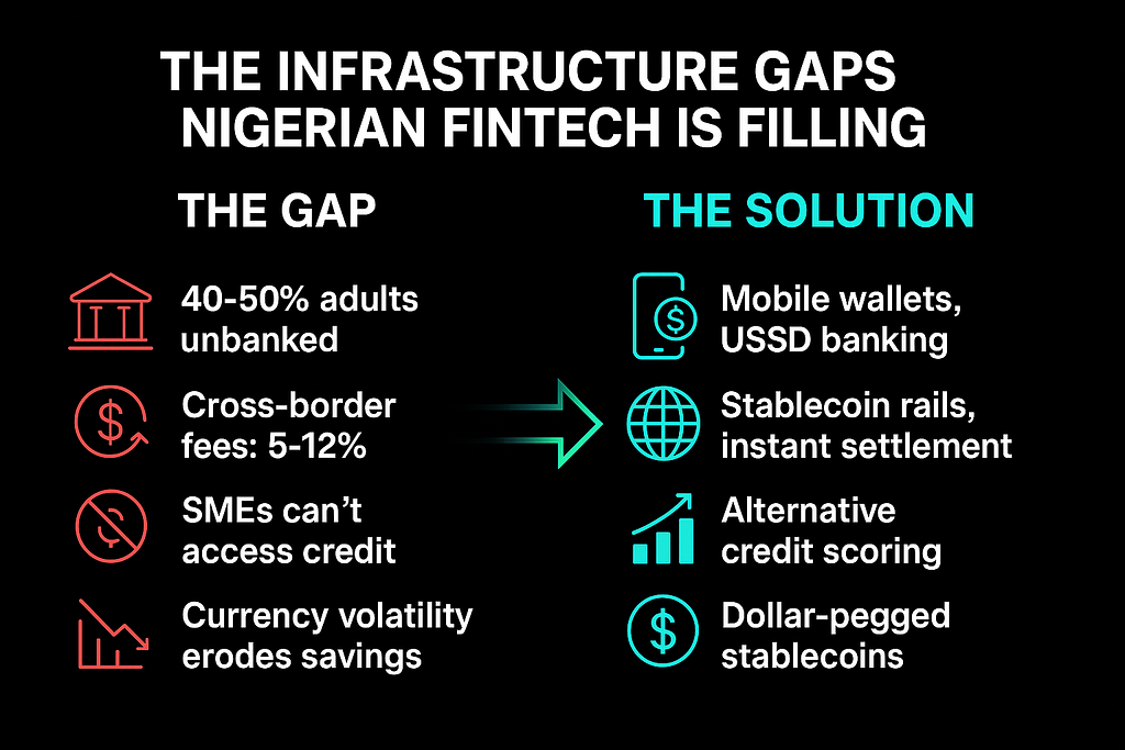 These aren’t “nice to haves.” They’re missing pieces of the financial system. Fintechs stepped in to fill these gaps with mobile wallets, USSD banking, alternative credit scoring using payment history, and stablecoin infrastructure for dollar-pegged savings.